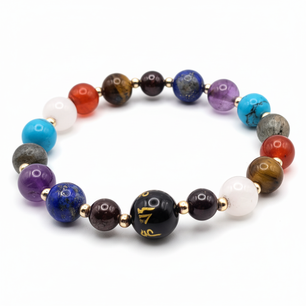 Ce bracelet rassemble 7 pierres pour équilibrer les centres énergétiques : améthyste, lapis lazuli, turquoise, aventurine, œil de tigre, cornaline et jaspe rouge. Il favorise l'harmonie globale du corps et de l'esprit.